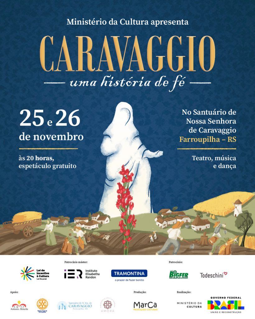 O público da Serra Gaúcha poderá assistir gratuitamente à segunda edição do espetáculo teatral Caravaggio: uma história de fé. A apresentação ocorre nos dias 25 e 26 de novembro, em frente ao Santuário de Nossa Senhora de Caravaggio, em Farroupilha (RS). O projeto é aprovado pela Lei de Incentivo à Cultura (Lei Rouanet) e reunirá grupos de teatro, dança e música de toda região.